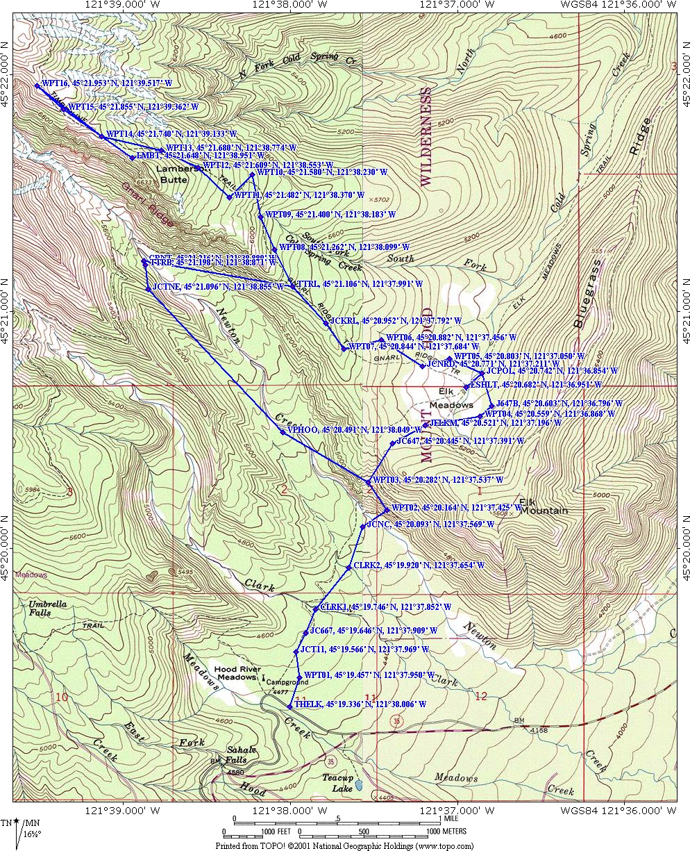 Trail: Elk Meadows Trail #645, Gnarl Ridge Tie Trail #652A, Gnarl Ridge Trail #652, Timberline Trail #600, Newton Creek Trail #646. Connections to Umbrella Falls Trail #667, Bluegrass Ridge Trail #647, Bluegrass Ridge Tie Trail #647B